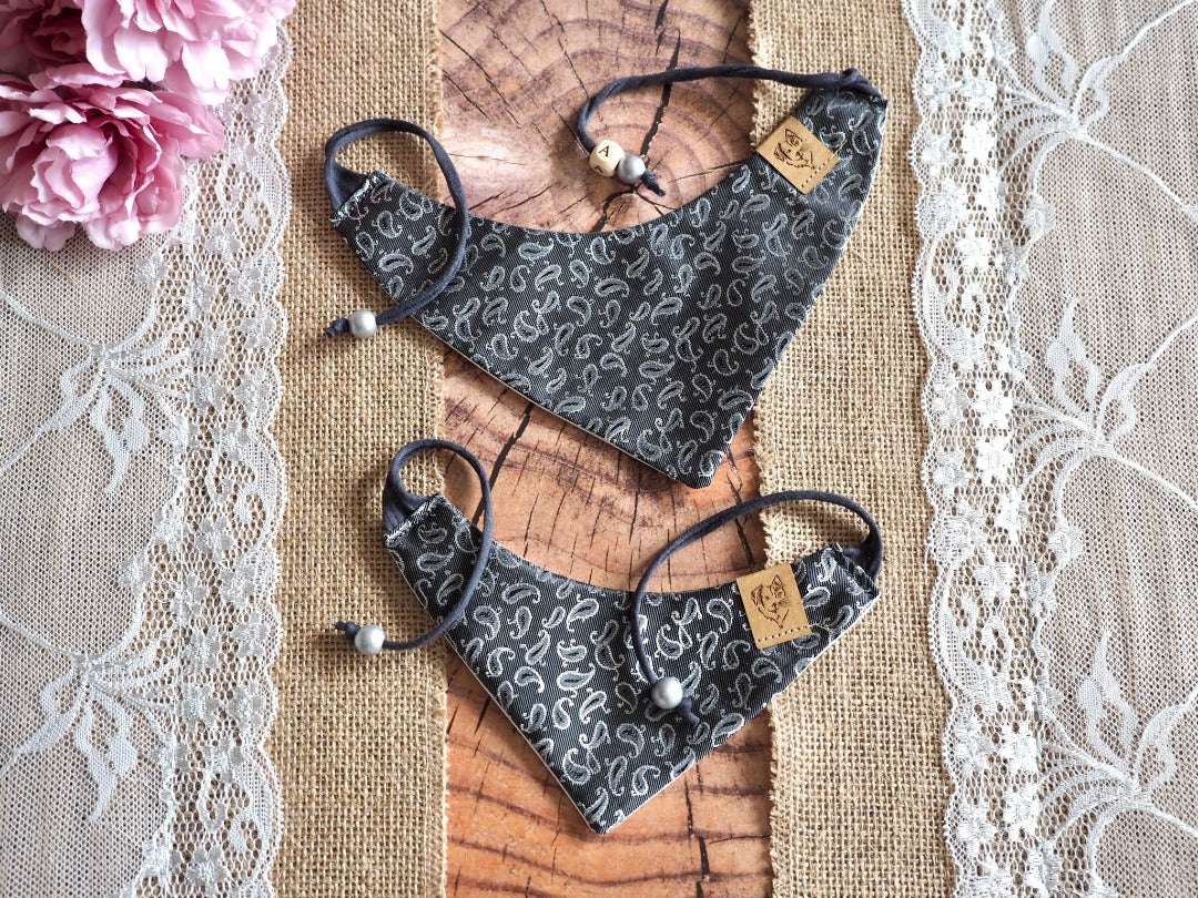 Euer Hund soll auf der nächsten Hochzeit besonders schick aussehen? Dann kommt hier unser handgemachtes Hundehalstuch aus hochwertigem Satin- und Baumwollstoff mit elegantem Paisley-Muster in glänzendem Grau. Damit wird euer Hund zum Highlight jeder Hochzeit und eventuell auch zur Konkurrenz für den Bräutigam :)