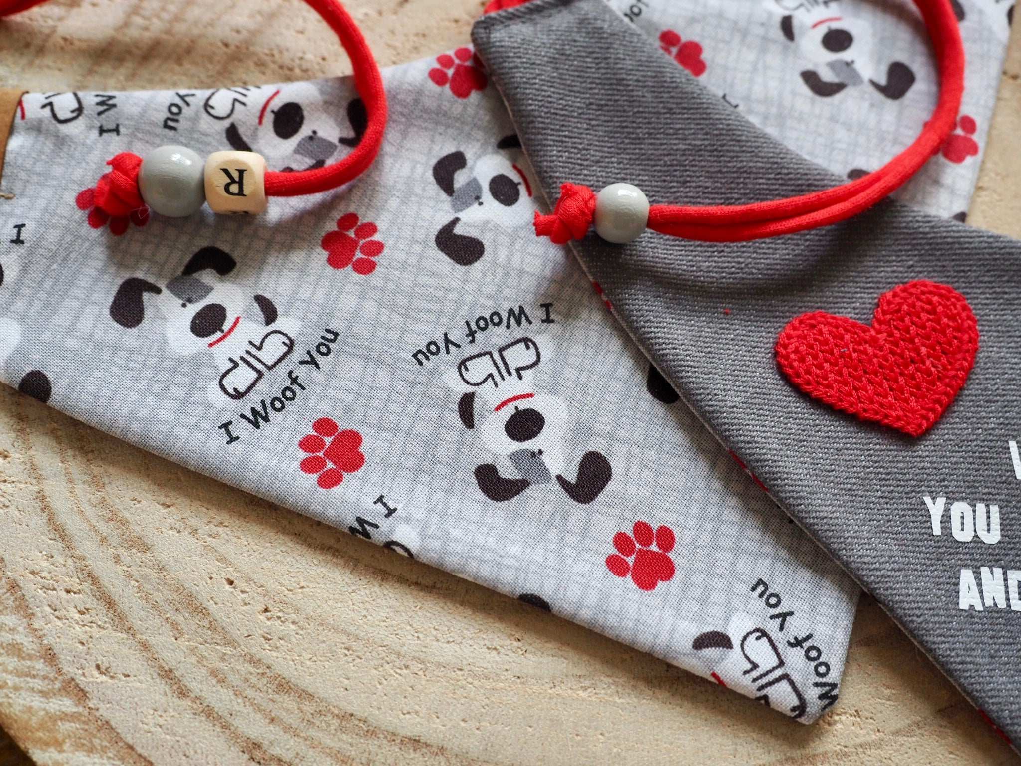 Wie fast all unsere Halstücher ist auch dieses Modell beidseitig tragbar. So habt ihr 2 Designs in einem und die Qual der Wahl zwischen der bedruckten Vorderseite und der grauen Rückseite mit I woof you Print :)